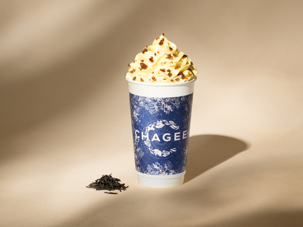 Indulge in a refreshing cup of chilled Da Hong Pao paired with fragrant white peach fresh cream and topped with freeze-dried fig bits.